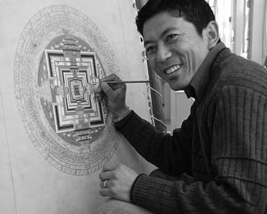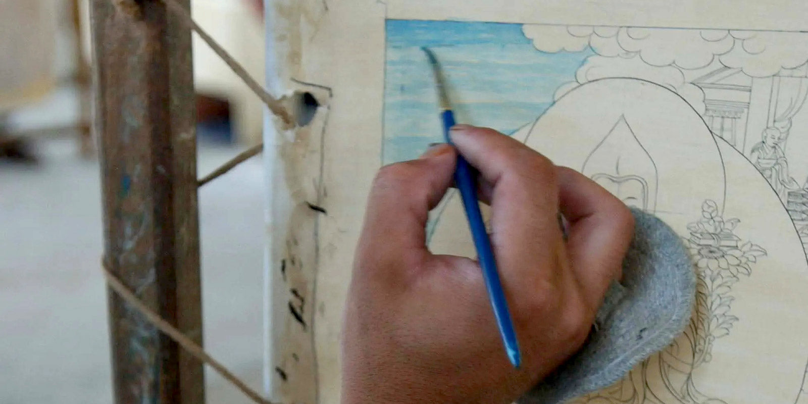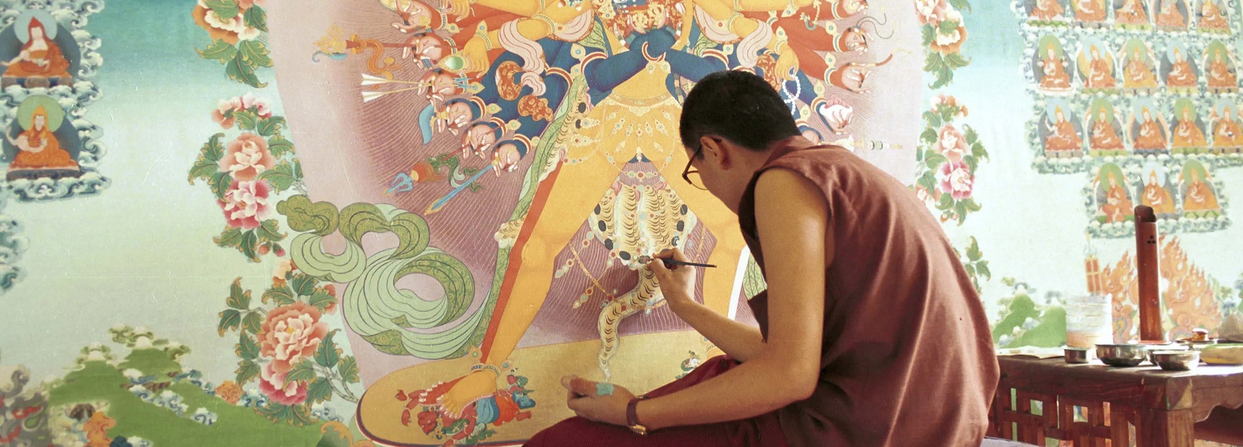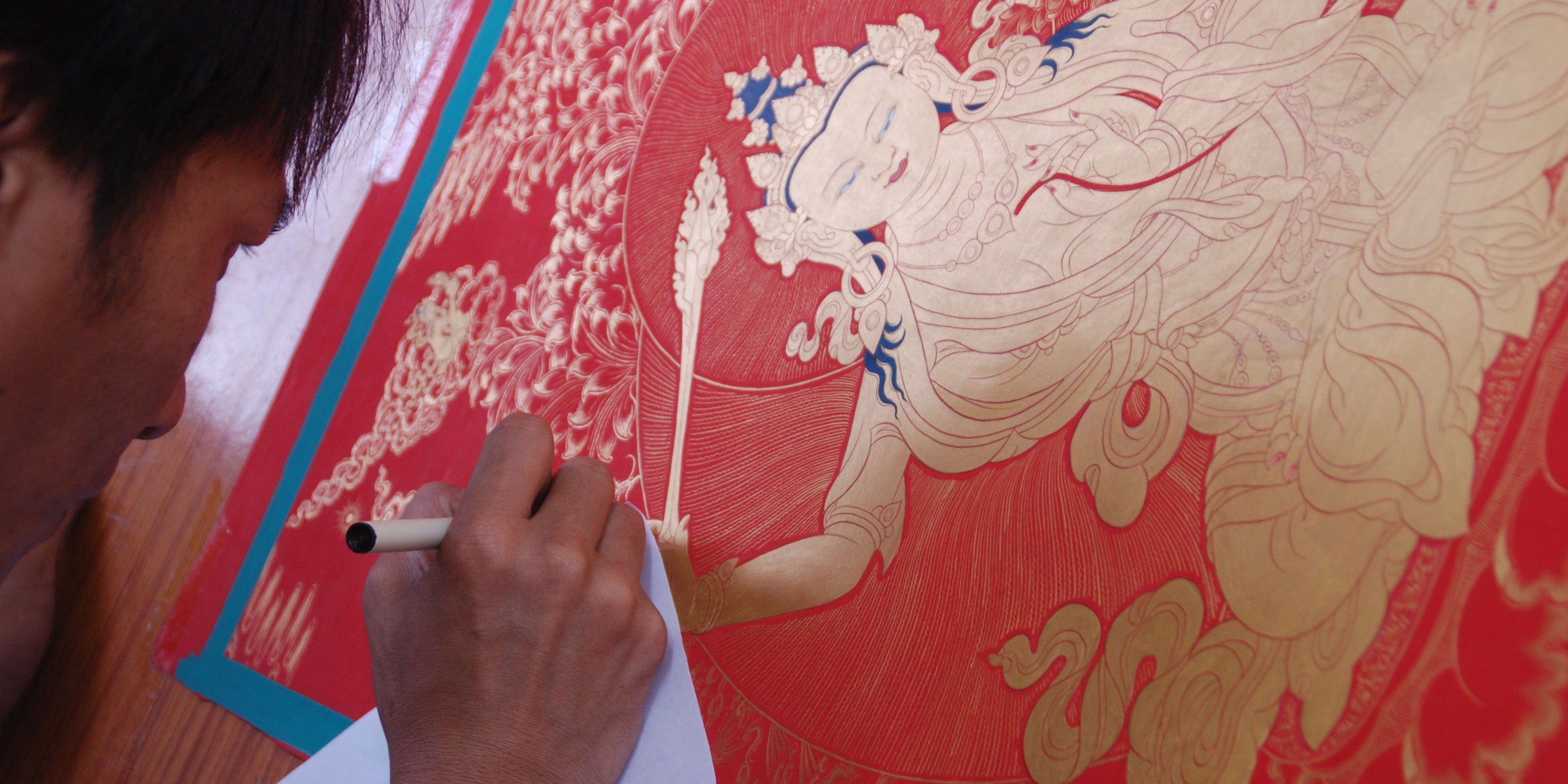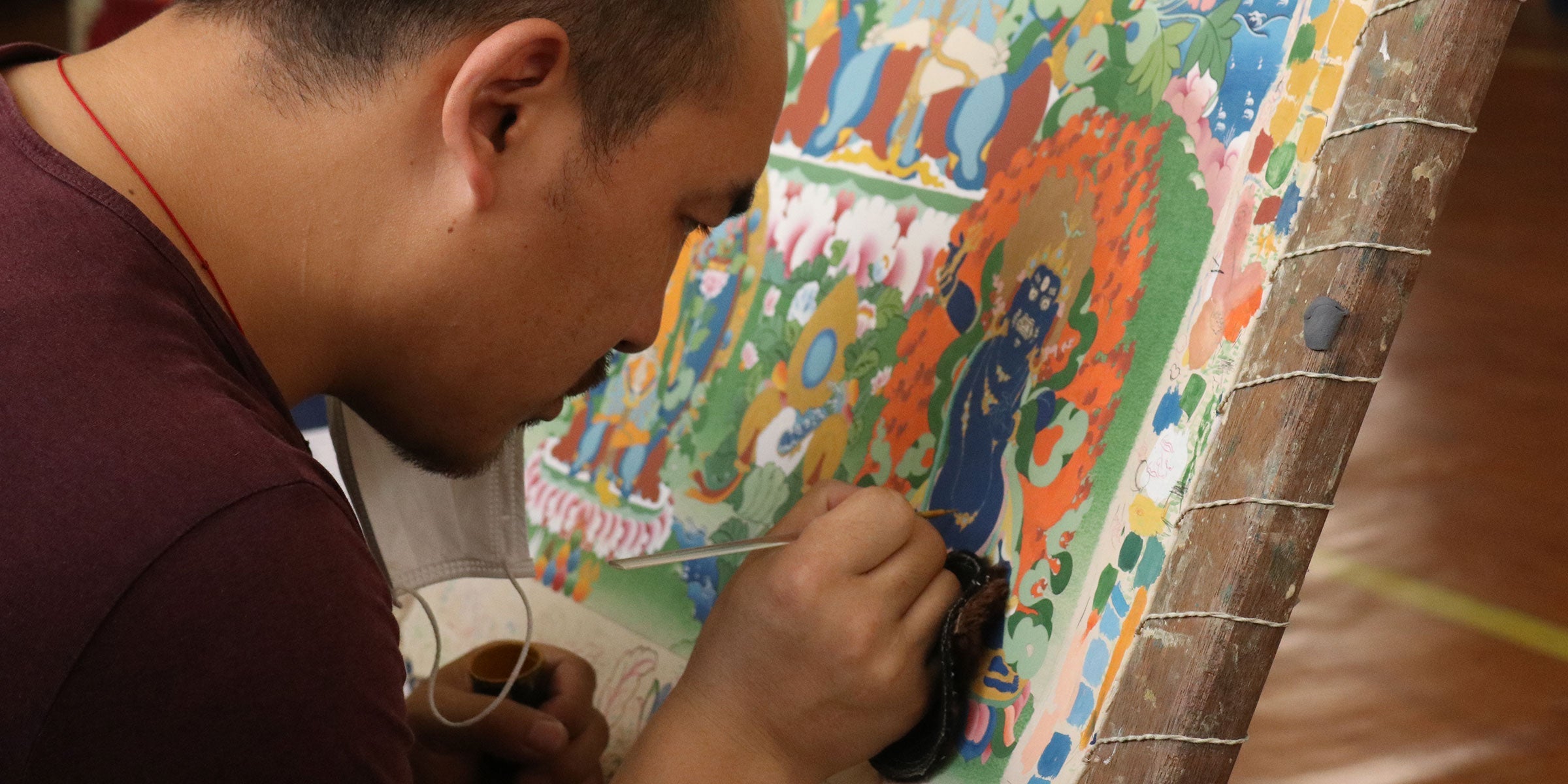 Aspiring thangka artists begin by studying the iconographic grids and proportions of different deities and then master mixing and applying mineral pigments. Norbulingka offers a three-year thangka training program. Upon completion, a student can join the workshop and apprentice for three years, assisting the masters or painting their own simple pieces, depending on their ability.