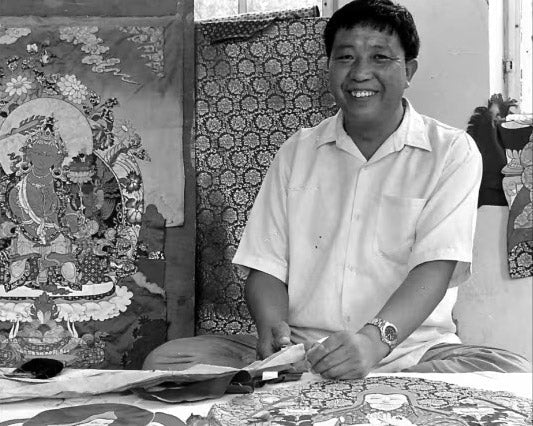 A thangka painter’s goal is to create images that inspire the viewer. Unlike Western works of art, which are the product of the artist’s personal ingenuity, Tibetan religious art is regarded as a way to communicate transcendental qualities to practitioners, the painter being the vessel. In the past, artists were often lamas, people with spiritual training whose talents were expressed spontaneously. Others were talented individuals who drew their inspiration and training from their masters, who themselves belonged to an unbroken line of artists reaching back for centuries.