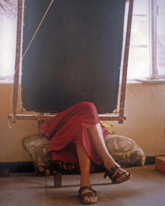 The first step in the making of a thangka is stitching canvas onto a wooden frame and preparing the surface with a mixture of chalk, gesso, and base pigment, which is rubbed in until the texture of the cloth is no longer apparent. The outline of the deity is then sketched in pencil using the iconographic grid pertaining to the deity being depicted, then outlined in black ink. Powders of crushed mineral and vegetable pigments are mixed with water and adhesive to create paint. Landscape elements are blocked in and shading is applied using both wet and dry brush techniques. Finally, 24 kt gold paint is added in certain areas for highlights, and the piece is framed in a precious brocade border. A standard thangka in our collection, which is about 18 x 12 in., takes an artist about six weeks to complete.