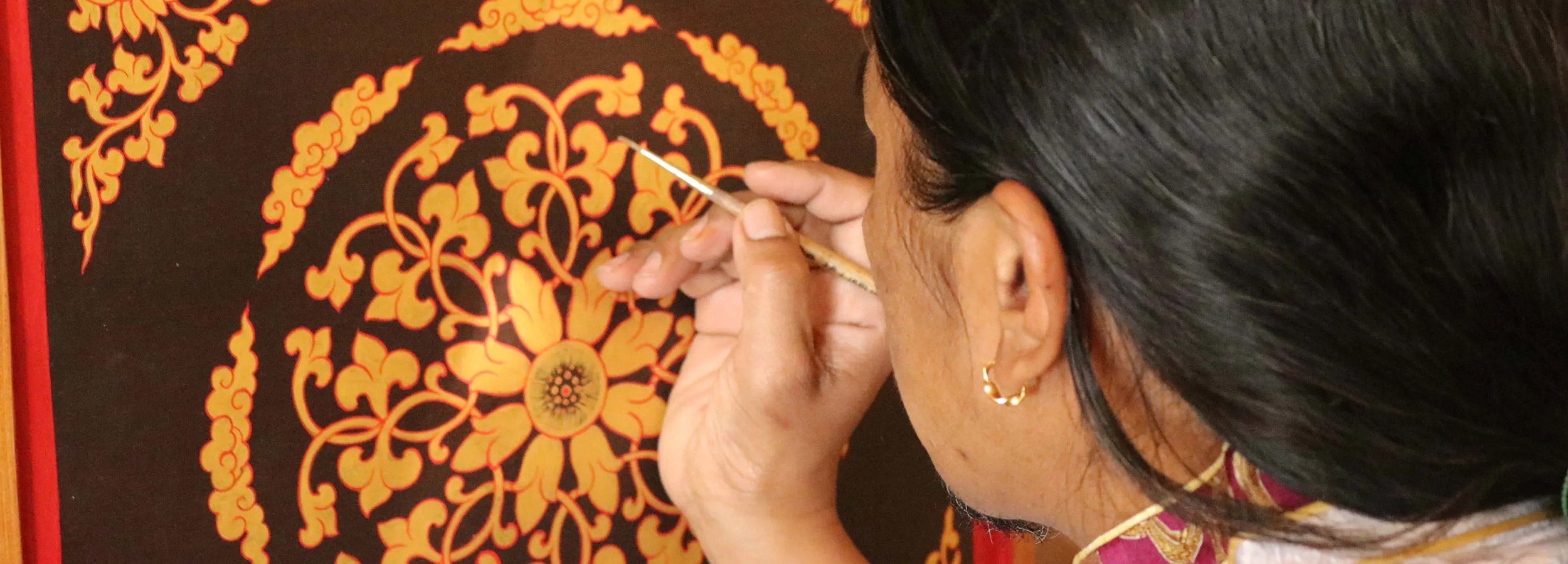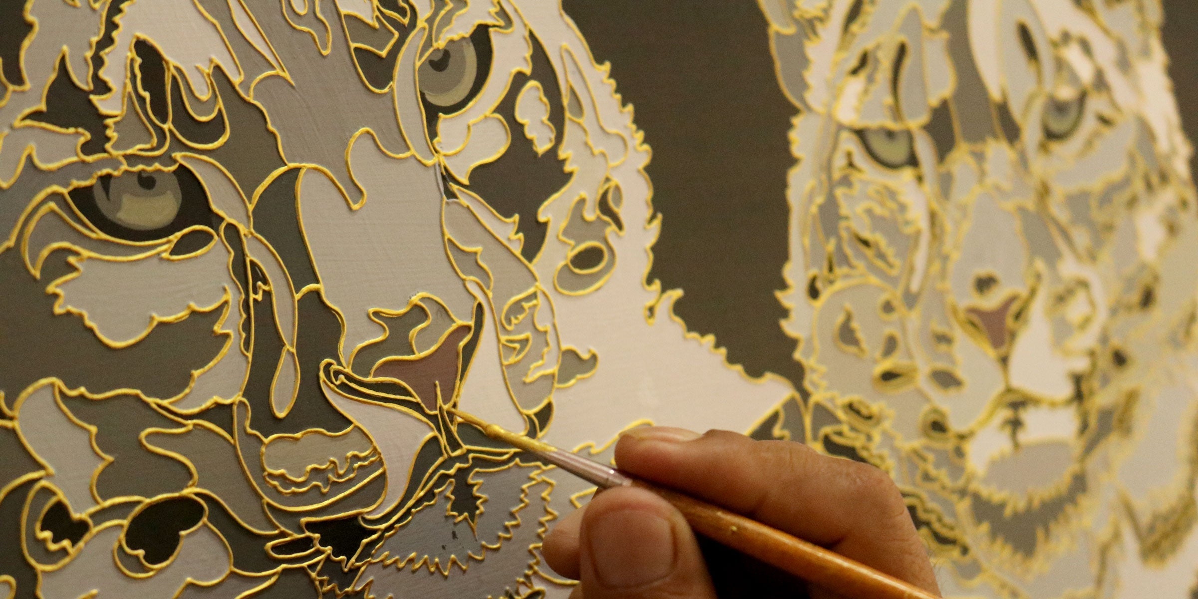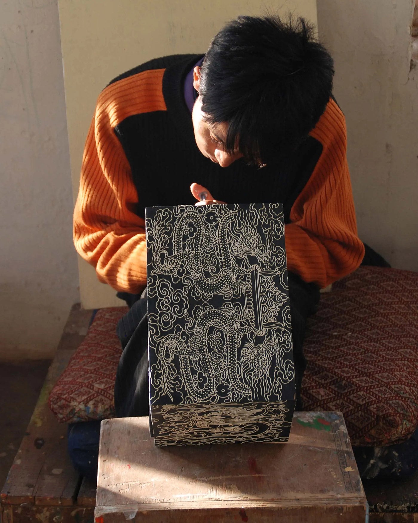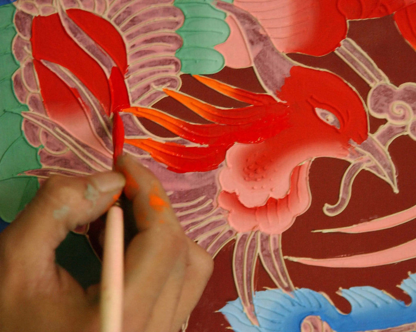 In the old days, a tube was used to squeeze a mixture of lime and molasses to outline the design being painted, but we have updated our methods a bit to make the product more durable and the outline clearer. In our workshops, we use a syringe to apply a mixture of paint and carpenter's glue. This technique requires an extremely steady hand, which takes months to develop. An artist must be able to trace the design perfectly in one smooth motion while at the same time squeezing out a consistent stream of paste from the syringe. When the relief outline has dried, the painters fill in the rest of the design with bright color.