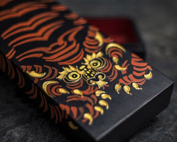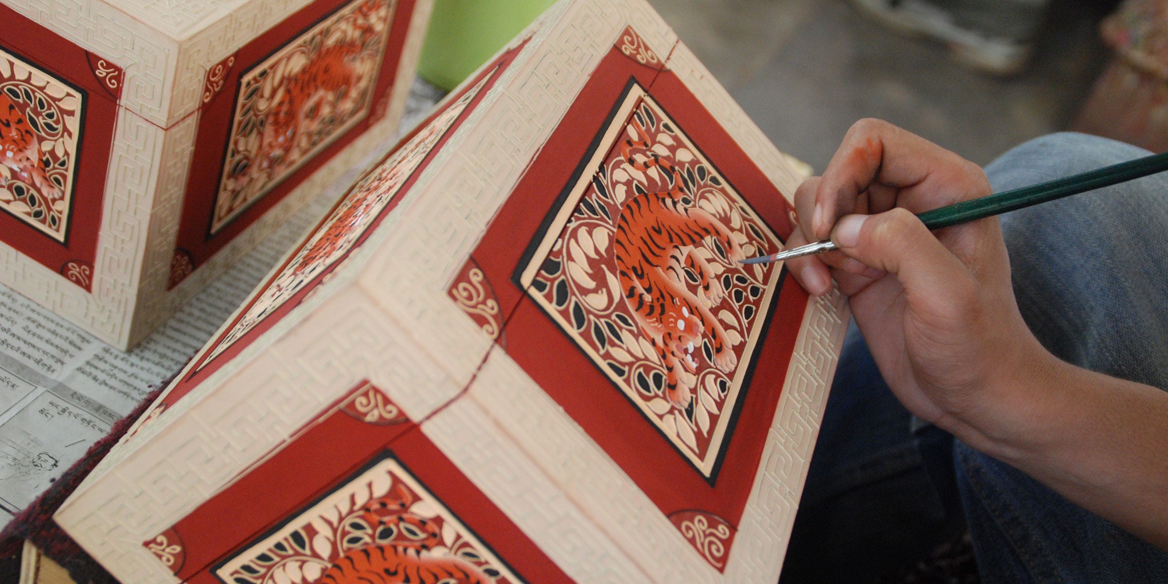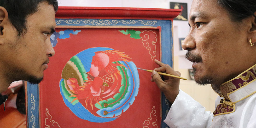 In Tibet, painting was both a sacred art used in the creation of thangkas and also a decorative one, used to ornament furniture and the walls of houses. While the uses of each are very different, the Tibetan aesthetic remains relatively consistent and easy to recognize in both religious and decorative art. Images and designs are highly stylized, with vibrant colors standing out on flat surfaces. While not a sacred art, Tibetan decorative art draws deeply from Tibet’s rich Buddhist tradition, often employing religious iconography such as the Eight Auspicious Symbols, the Five Offerings, and the Eight Precious Substances. Even many animals and landscape elements are considered religious significance, and it is believed to be good luck to fill your house and walls with such auspicious symbols of good luck.