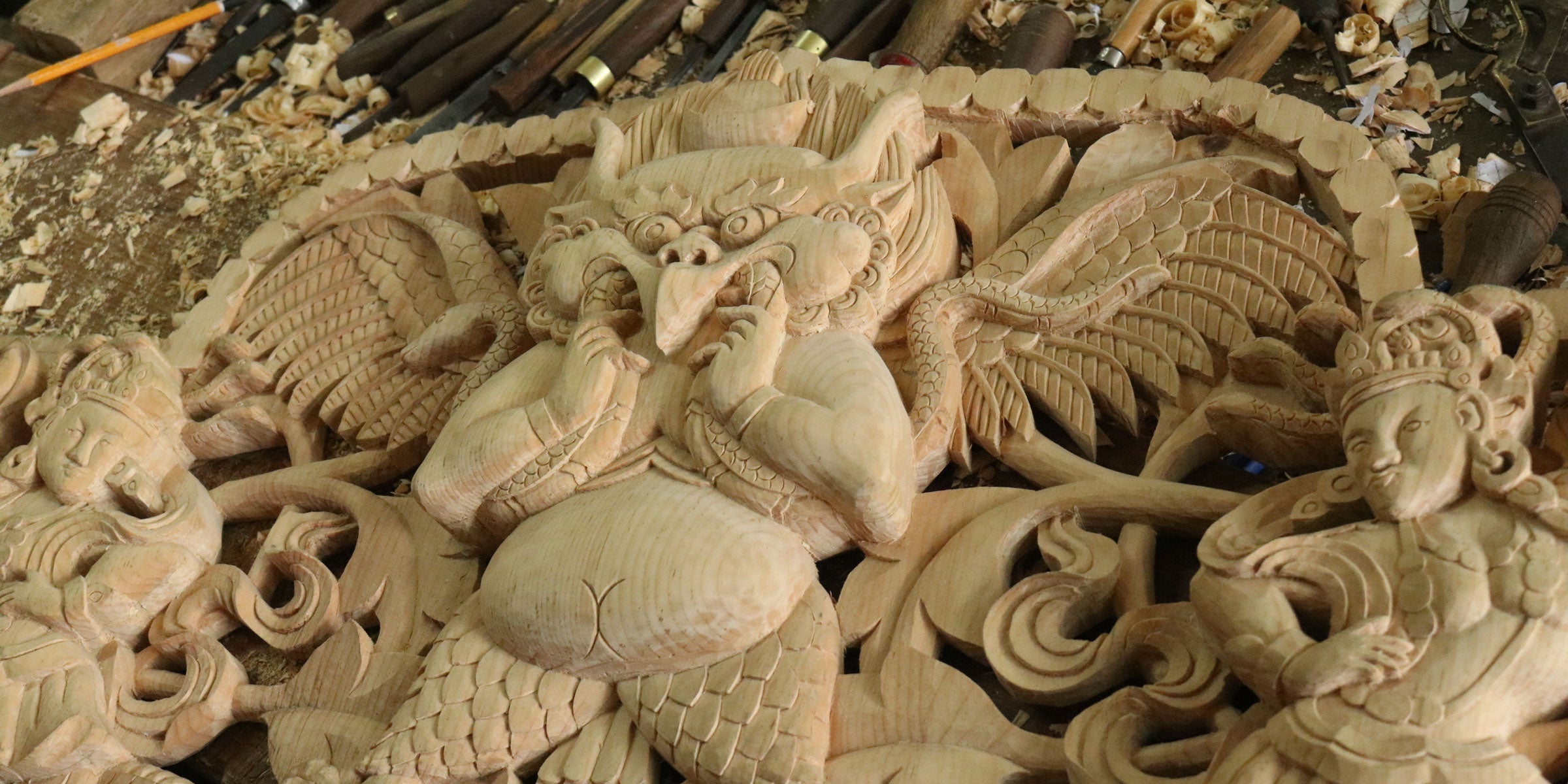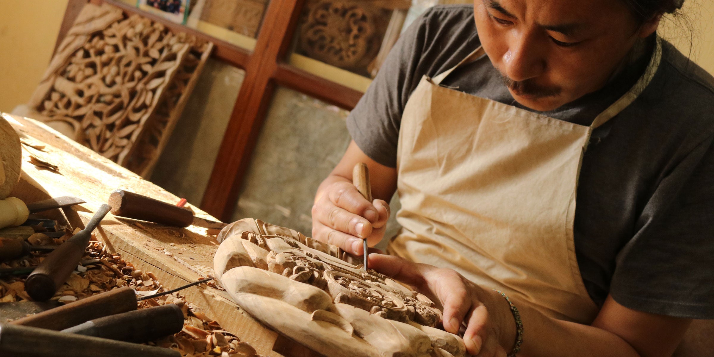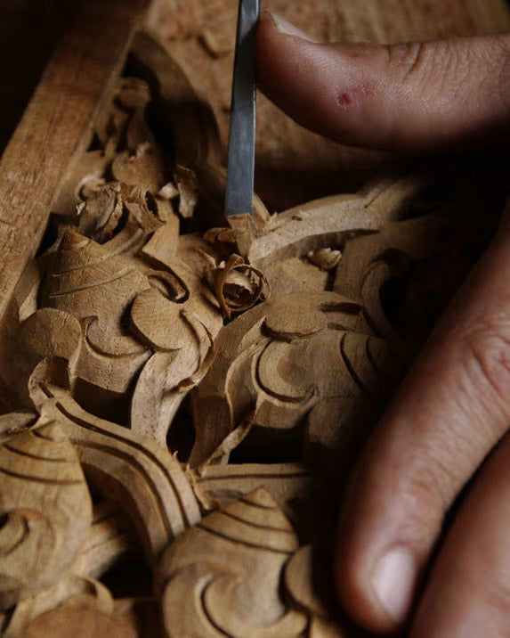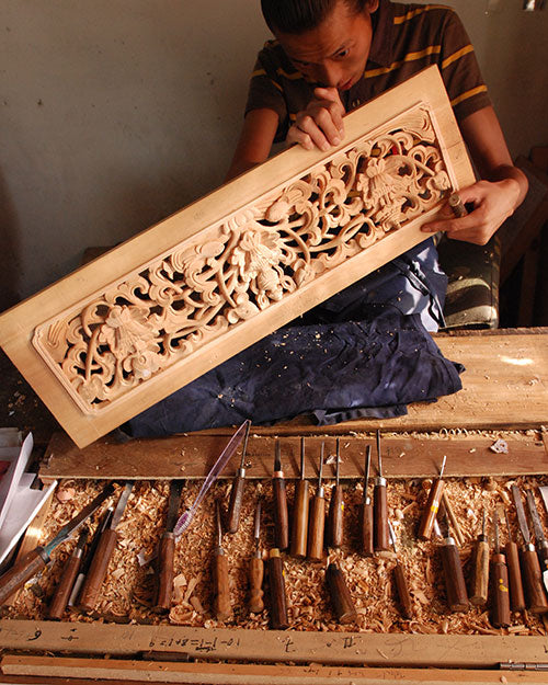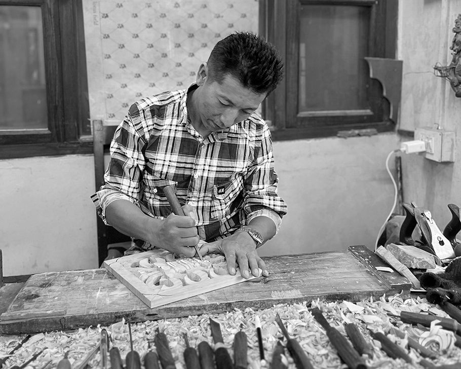 When carving, first, an image of the design is transferred onto the flat surface of the wood. Then, a Tibetan bamboo fret saw cuts out holes in the image. Finally, chisels are used to carve the design from both the front and back, creating depth. The initial training for woodcarving students is three years. For the first few months, students do not practice on wood but only focus on learning to draw traditional designs. Then they are taught how to make their own chisels, which will remain with them for a lifetime, and how to use them. Students first begin carving pinewood because it is much softer and forgiving, and they eventually move on to teakwood. Apprentices must also master fundamental carpentry techniques for cutting and joining pieces of wood. After their apprenticeship is completed, most carving students will have mastered the basic designs and techniques and will be ready to create more elaborate pieces, though the carved thrones and cabinets that adorn the shrine rooms and altars of great homes and monasteries will take many more years of practice.