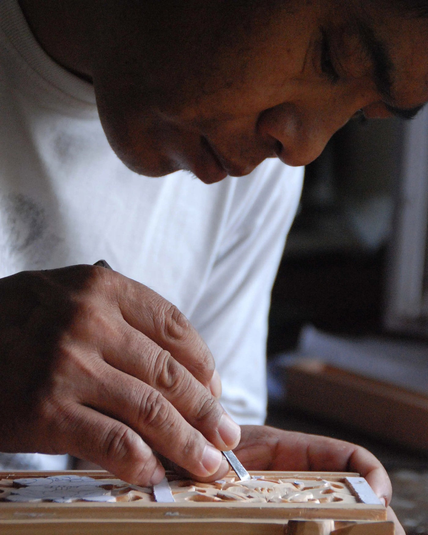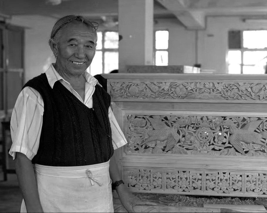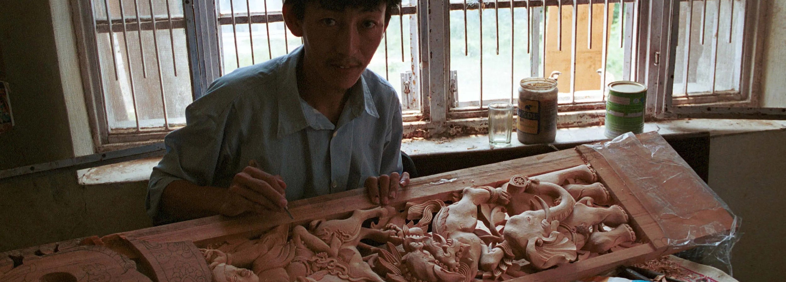 When carving, first, an image of the design is transferred onto the flat surface of the wood. Then, a Tibetan bamboo fret saw cuts out holes in the image. Finally, chisels are used to carve the design from both the front and back, creating depth. The initial training for woodcarving students is three years. For the first few months, students do not practice on wood but only focus on learning to draw traditional designs. Then they are taught how to make their own chisels, which will remain with them for a lifetime, and how to use them. Students first begin carving pinewood because it is much softer and forgiving, and they eventually move on to teakwood. Apprentices must also master fundamental carpentry techniques for cutting and joining pieces of wood. After their apprenticeship is completed, most carving students will have mastered the basic designs and techniques and will be ready to create more elaborate pieces, though the carved thrones and cabinets that adorn the shrine rooms and altars of great homes and monasteries will take many more years of practice.